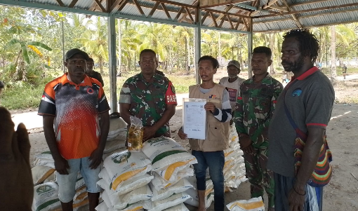 Babinsa Koramil 1710-01/Kokonao, Kodim 1710/Mimika dampingi petugas Bulog Kancab Timika salurkan beras bantuan untuk warga miskin. Distrik Amar. Foto: Pendim 1710/Mimika.