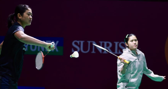 Ganda putri Lanny Tria Mayasari/Amallia Cahaya Pratiwi mencoba lapangan pertandingan. Foto: Humas.